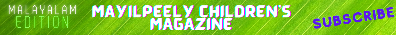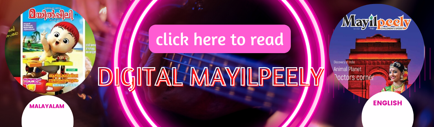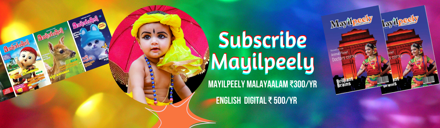 Mayilpeely is the print and digital magazine written and illustrated by young writers and artists. It is the leading publisher of creative writing by children ages 8 to 15. Most of Mayilpeely’s subscribers are in the Kerala , but we have subscribers in other states also. MAYILPEELY brings a unique blend of brain-stretching ideas and irreverent fun to thousands of young fans around the world every month. Full of exuberant articles and puzzles, it is beautifully illustrated throughout, and every magazine covers science, history and general knowledge.
